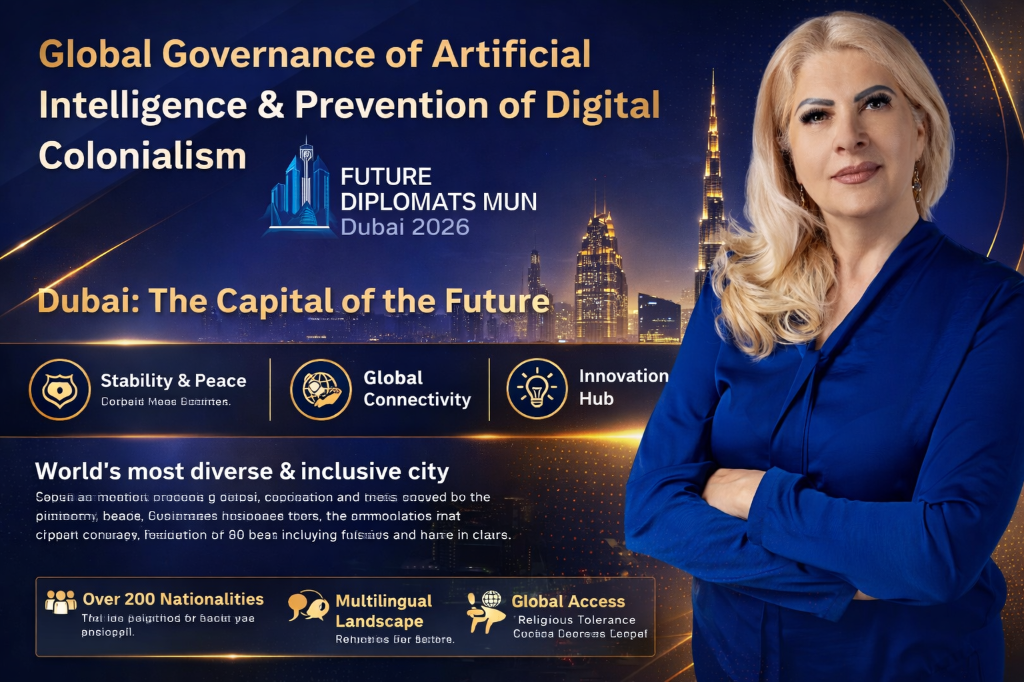 Future Diplomats MUN Dubai 2026 is an international conference focused on global diplomacy, AI governance, and preventing digital colonialism.